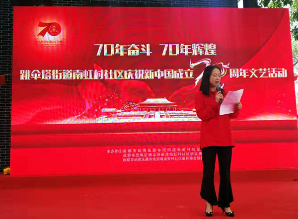 9月27日下午两点,由南虹村社区主办的庆祝新中国成立70周年文艺活动在南虹村社区小广场拉开帷幕,驻区单位代表、社区党员及居民齐聚广场,向祖国献上了真诚的祝福。