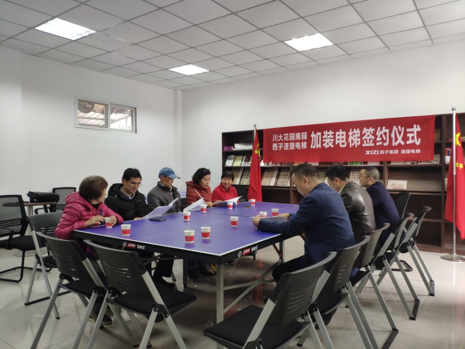 325日上午10:30,川大花园南园92单元增设电梯合同签约仪式在社区建设办公室会议室举行。川大花园南园92单元相关业主代表、速捷电梯公司代表及四川大学社区建设办公室相关人员参加了签约仪式。