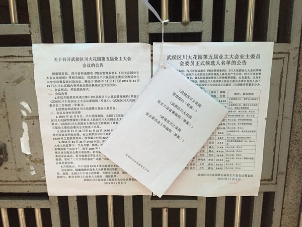 筹备组按照望江路街道办事处下发的“业委会换届选举相关流程”,根据小区自身情况,于10月底启动了对《武侯区川大花园管理规约》(草案)、《武侯区川大花园业主大会议事规则》(草案)和《武侯区川大花园业主委员会工作规则》(草案)三个文件的修改,并于11月9日将上述《三个文件》(草案)的修改稿在南园和北园的小区大门处进行了公示,同时也在每个单元门前进行了公示。根据相关规定,筹备组将《三个文件》(草案)提交到11月25日召开的业主大会上进行投票表决。