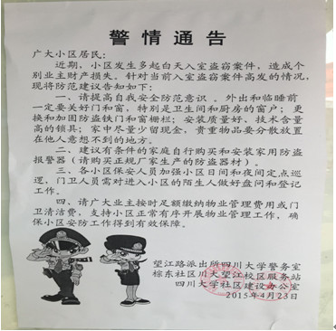 近期,望江校区个别小区出现住户财物被盗的情况,为进一步加强小区安防工作,减少盗窃案件的发生,社区建设办公室积极协助望江路派出所和棕东社区川大望江服务站开展小区安全宣传工作,通过张贴警情通告及相关防范建议等措施来扩大防盗的宣传面,以提高小区居民的家庭防盗意识。