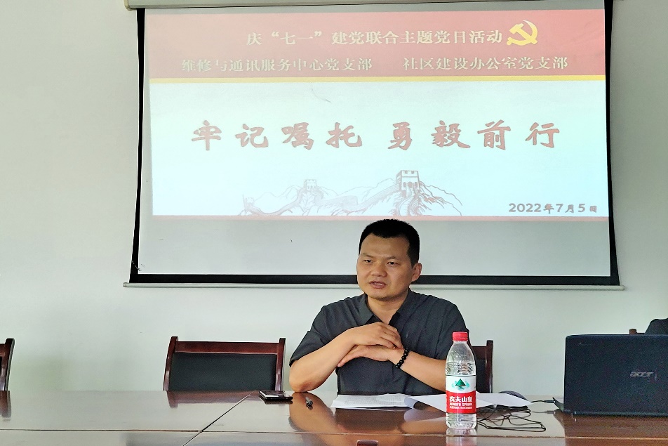 为庆祝建党101周年,迎接党的二十大顺利召开,丰富党员组织生活,提升党员荣誉感,提高党组织的凝聚力和号召力,建设基层服务型党组织,维修与通讯服务中心党支部和社区建设办公室党支部联合开展庆“七一”建党日主题活动。活动由后勤保障部党委委员周密副部长主持。