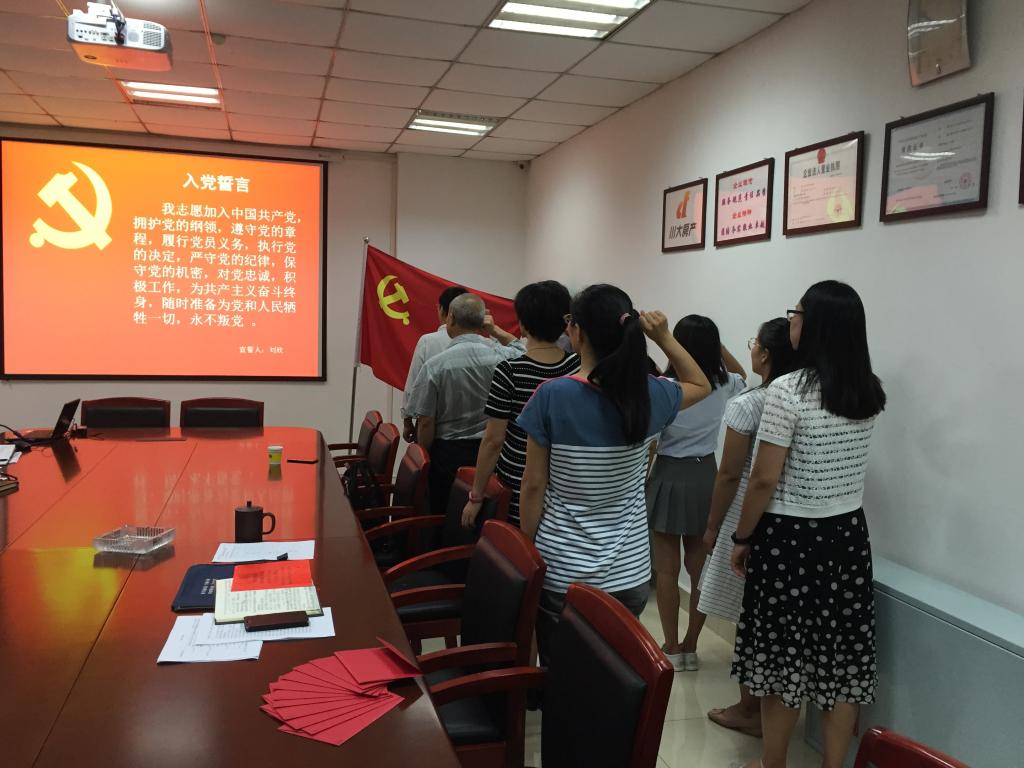 随后,举行了新党员入党宣誓、老党员重温入党誓词仪式。经过支部严格考察,以及上级党组织批准,刘欣同志光荣地加入了中国共产党。在庄严的党旗下,由严成辉同志领誓,刘欣同志和老党员们一起,面对党旗,举起右拳,庄严宣誓。